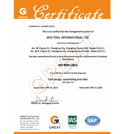 With more than 40 years of experience in Automotive & Motorcycle Specialty Tool manufacturing and supply, we see quality control is a vital element in producing high quality tools that meet customer expectations. Aiming to achieve Apo Tool’s production standard, all the following manufacturing processes are conducted in Taiwan – Turning, Milling, Drilling, Stamping, Linear Cutting, Casting, Forging, Heat Treatment, Polishing, Sand blasting, Electroplating, Painting, Shaping, Welding, Bending, Coating Treatment.